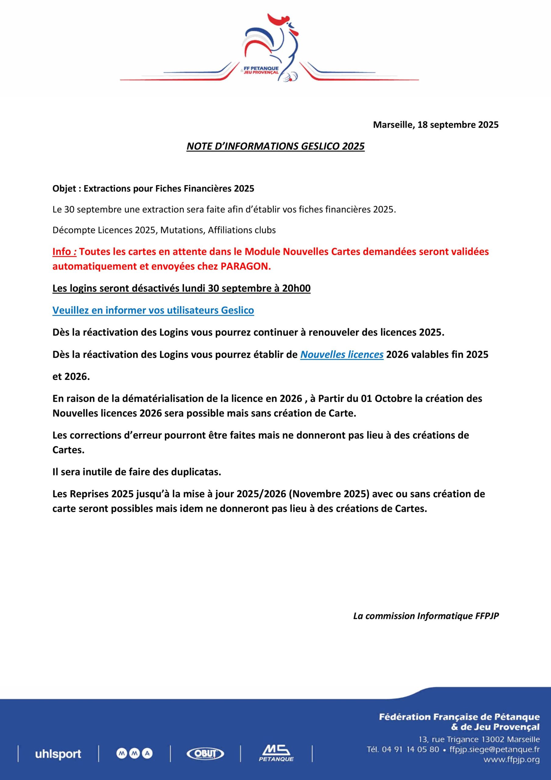 NOTE D’INFORMATIONS GESLICO 2025 Posted on 23 septembre 2025 by CD 48 Pétanque 20250918-Message-Geslico-FF_2025Télécharger Partager cet article : on Twitter on Facebook on Google+
